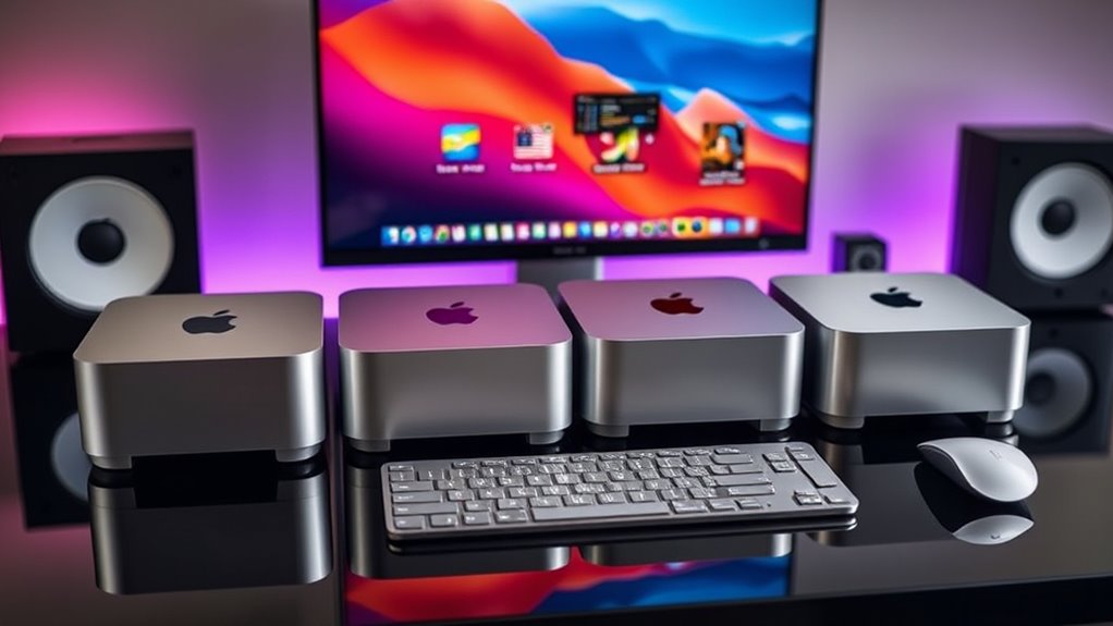 Maximizing your Mac Mini’s performance hinges on selecting the right amount of memory and storage. Larger RAM, such as 24GB or 32GB, boosts multitasking and handles demanding apps with ease, making it ideal for creative professionals. Storage options usually start at 512GB SSD, with 1TB or 2TB options available for extensive data needs. SSD storage offers much faster data access and transfer speeds than traditional HDDs, resulting in snappier system responsiveness. Since storage isn’t typically upgradable later, choosing the right capacity upfront is critical to meet future demands. Adequate memory and storage tailored to your workflow help prevent bottlenecks, ensuring smooth operation whether you’re editing videos, running complex software, or managing large files.