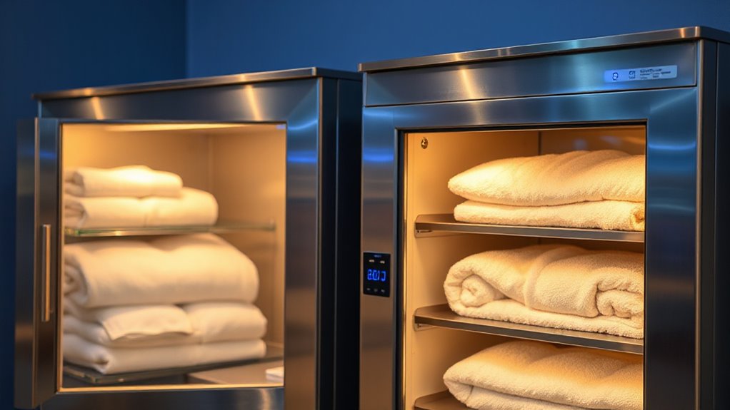 Selecting the right capacity and size for a spa-grade hot towel cabinet with UV depends on your specific needs and workspace constraints. Smaller setups may only require compact models holding around 10 towels, with external dimensions of roughly 8-15 inches. Larger facilities or high-volume environments benefit from bigger units, like 36L or 72L models, capable of accommodating more towels simultaneously. The internal space and shelf configuration are vital, as they determine how efficiently you can store and heat towels at once. Consider your workflow and storage needs to guarantee smooth operations. Proper sizing helps optimize space utilization and keeps your workspace organized. Whether you need a cozy, personal unit or a high-capacity professional cabinet, choosing the right size ensures you meet your demands without unnecessary clutter.