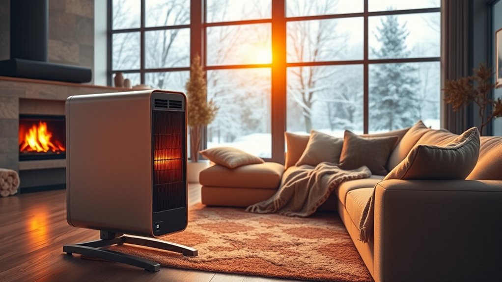 Selecting a space heater that effectively warms a large room requires careful attention to its coverage area. It’s crucial to match or exceed the room’s size, usually measured in square feet. Review the heater’s specifications to verify its heating capacity aligns with larger spaces, typically around 250-300 ft². Models with adjustable oscillation features help distribute heat evenly across vast areas. The heater’s power wattage, often around 1500W, should be sufficient to heat large spaces efficiently. Additionally, a high airflow rate, combined with rapid heat output and wide-angle oscillation, guarantees thorough warmth. Proper room size compatibility guarantees the heater can maintain a consistent, comfortable temperature without overstressing the unit or wasting energy. This careful selection maximizes comfort and efficiency in large rooms.