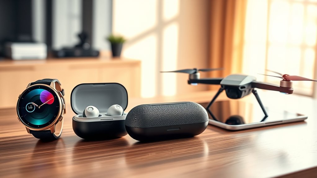 When choosing tech gadgets, safety features are essential. Look for devices with strong encryption to protect personal data, and those with automatic shutdown or alerts if overheating occurs. Devices with sturdy construction and water resistance prevent damage and guarantee longevity. Additionally, features like parental controls, secure authentication methods, and regular firmware updates help keep users safe. Prioritizing these features ensures the gadget is both user-friendly and secure for everyday use.