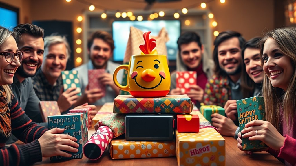 Looking for the perfect white elephant gifts under $50 that will bring laughs and fun moments? Popular options include humorous novelty items like the Screaming Goat, quirky kitchen gadgets such as breakfast sandwich makers, and bathroom games like mini golf. Practical gifts like stainless steel tumblers or waterproof Bluetooth speakers also shine. These selections balance humor, usefulness, and uniqueness, ensuring everyone enjoys the exchange. To discover more exciting gift ideas and tips, keep exploring this list.