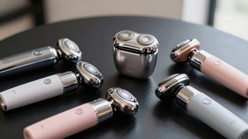 Choosing a high-end women’s electric razor with the right portability and design can make all the difference in my grooming routine. I look for compact, lightweight models that are easy to handle and carry, especially when traveling. Ergonomic shapes and textured grips give me better control and comfort, making detailed grooming simpler. Many high-end razors feature travel-friendly options like charging docks, cordless use, and protective cases, which are perfect for on-the-go convenience. Waterproof or water-resistant devices allow safe use in the shower or bath, adding versatility and easier cleaning. Plus, sleek, stylish designs make these razors visually appealing and suitable for gifting or display. Overall, thoughtful design and portability enhance my grooming experience, making maintenance quick, easy, and enjoyable.